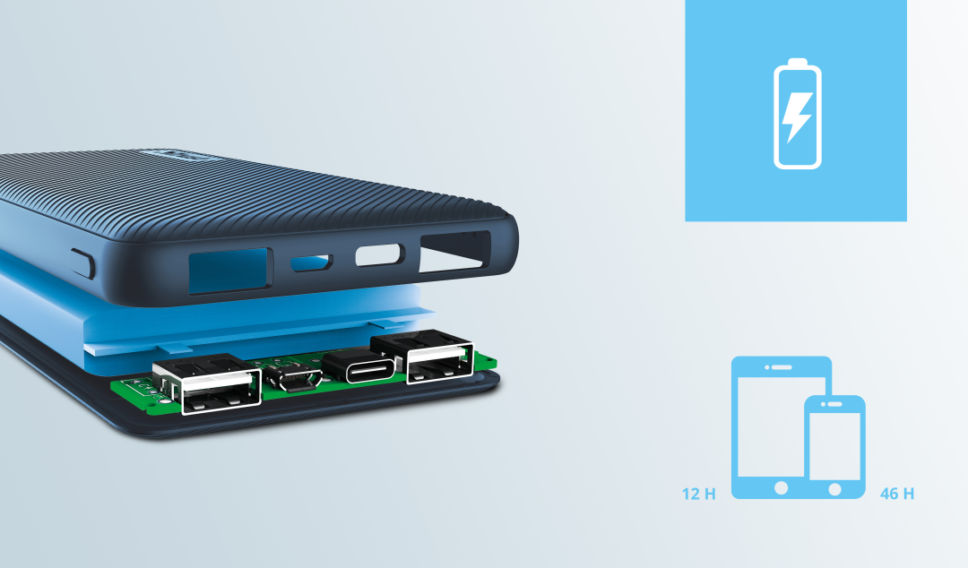 Niewielki rozmiar, ale duża funkcjonalność, Primo oferuje pojemność 10.000 mAh w kompaktowej konstrukcji i łatwo mieści się w każdej torbie. Dzięki temu towarzyszowi podróży możesz podładować swoje urządzenie, gdy jesteś poza domem, w pełni naładując telefon nawet 4 razy i zapewniając do 46 dodatkowych godzin baterii telefonu lub 12 dodatkowych godzin na tablecie.