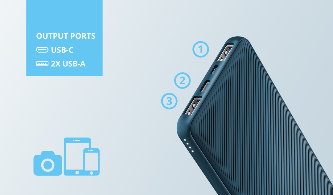 Dzięki 2 portom USB-A i 1 portowi USB-C możesz ładować praktycznie każde urządzenie dowolnej marki, w tym Apple i Samsung. Możesz także ładować także dwa urządzenia jednocześnie.