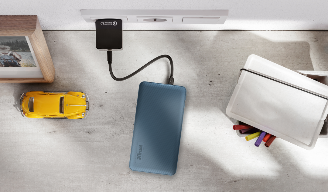 Trust Primo Powerbank 10.000 mAh jest szybki i inteligentny. Automatycznie dostarcza maksymalną moc do Twoich urządzeń. Możesz także szybko naładować powerbank za pomocą dołączonego kabla micro-USB lub przez port USB-C. Inteligentny wskaźnik poziomu LED na powerbanku informuje o aktualnym stanie naładowania powerbanka.