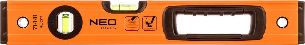 Poziomnica aluminiowa 40 cm, 3 libelle z systemem łatwego odczytu, uchwyt, 2 nasadki antywstrząsowe, grubość profilu 1.2 mm, dokładność 0.029°=0.5mm/m