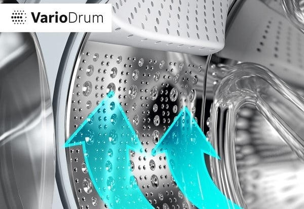 Twoje ulubione lub delikatne ubrania mogą ulec zniszczeniu po wielu cyklach prania. Unikalny, opatentowany system VarioDrum delikatnie i skutecznie pierze tkaniny każdego rodzaju, równomiernie rozprowadzając wodę bez rozciągania, marszczenia lub niszczenia naszych ulubionych ubrań. W zależności od wybranego programu, perforacje ułożone w kształcie fali i asymetryczne zabieraki delikatnie obracają pranie do środka, niezależnie od kierunku obrotów. Zapewnia to nie tylko intensywne czyszczenie silniej zabrudzonej odzieży, ale także szybsze i dokładniejsze pranie całego wsadu.