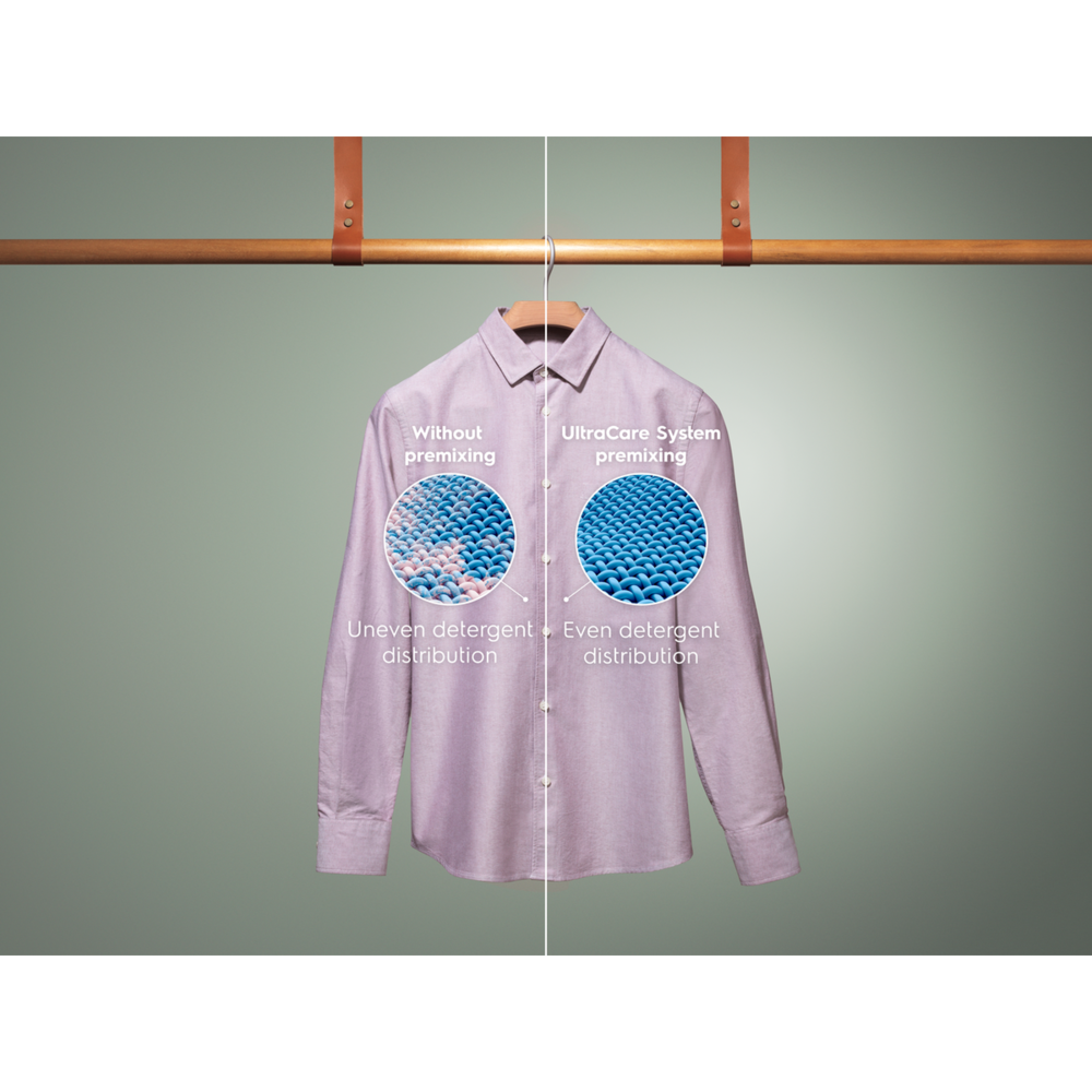 Ciesz się dłużej ulubionymi ubraniami dzięki systemowi UltraCare. Zapewnia on wstępne mieszanie detergentu i płynu zmiękczającego z wodą, zanim jeszcze dotrą do bębna, dzięki czemu są równomiernie rozprowadzane w praniu. Przyspiesza to ich działanie i zapewnia ochronę włóknom tkanin.