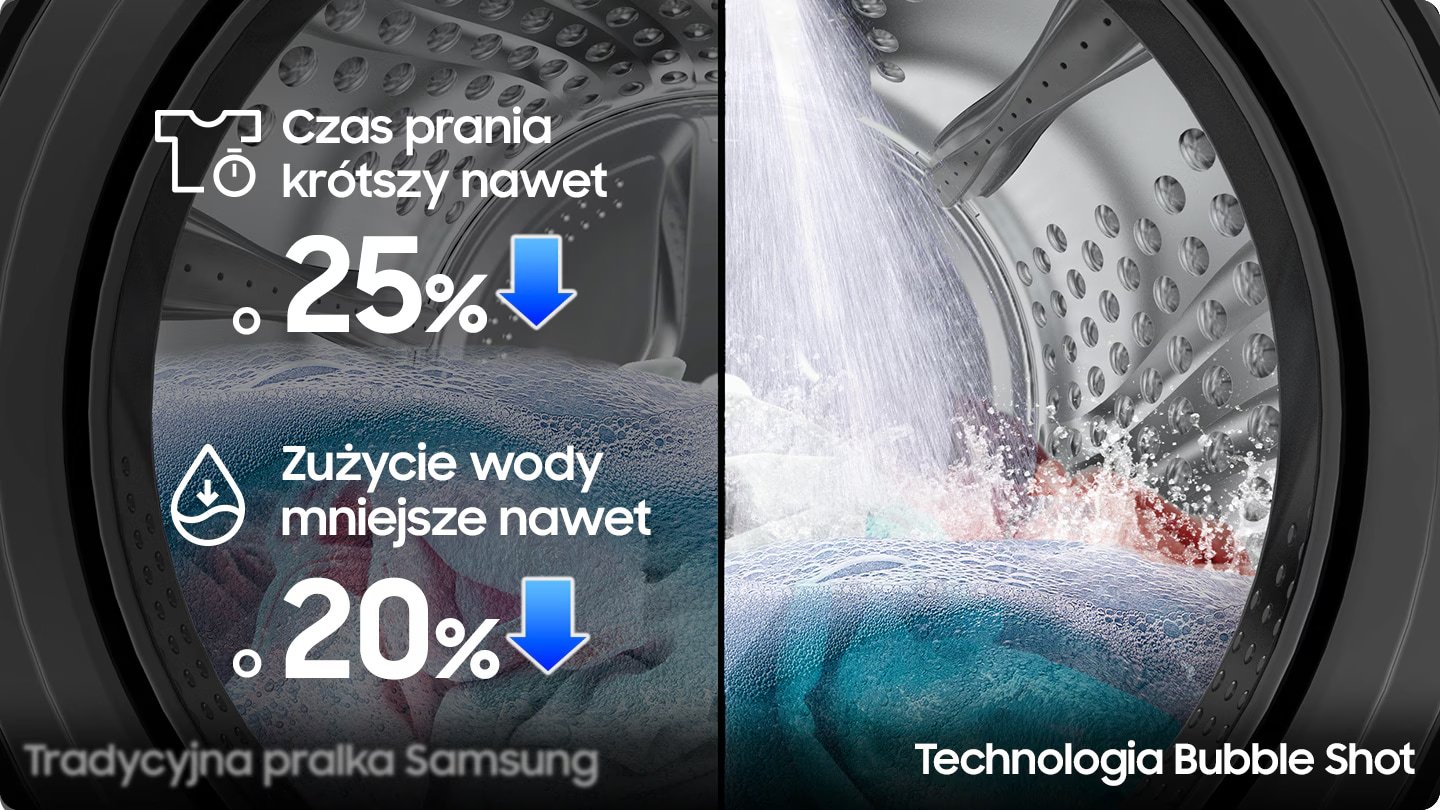 * Na podstawie testów wewnętrznych, przy użyciu programu Bawełna w modelu WW7400D z funkcją Bubble Shot™ w porównaniu do standardowej pralki Samsung bez funkcji Bubble Shot™. Wyniki mogą się różnić w zależności od rzeczywistych warunków użytkowania.