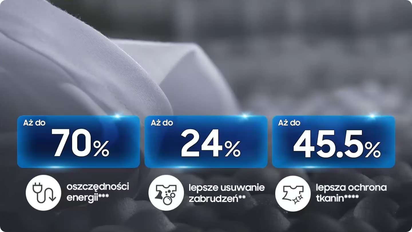 * AI EcoBubble działa tylko na określonych programach, w tym Bawełna, Syntetyczne, AI Wash z załadunkiem mniejszym niż 2 kg. ** Testy wg normy IEC 60456-2010 dla wsadu o wadze 4 kg: program Pranie Super Eco (model WF80F5E5U4W) vs. bawełna 40°C bez EcoBubble™ (model WF0702WKU). Wyniki mogą się różnić. *** Na podstawie raportu z testu Performance Lab przeprowadzonego przez Springboard Engineering z użyciem pasków EMPA, badającego różnice między roztworem zwykłego środka piorącego a technologią aktywnej piany bez działania mechanicznego. Wyniki mogą się różnić.