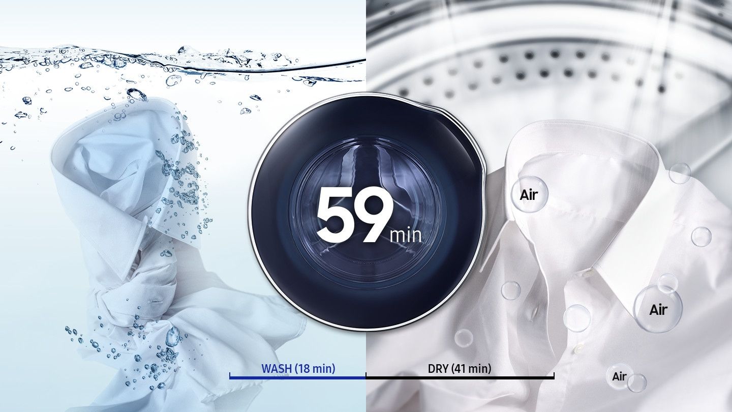 Nie musisz już czekać, aż pranie samo wyschnie. Idealne rozwiązanie kiedy potrzebujesz szybko wyprać i założyć ulubioną bluzkę. Wyjmij idealnie suche pranie po 59 minutach.