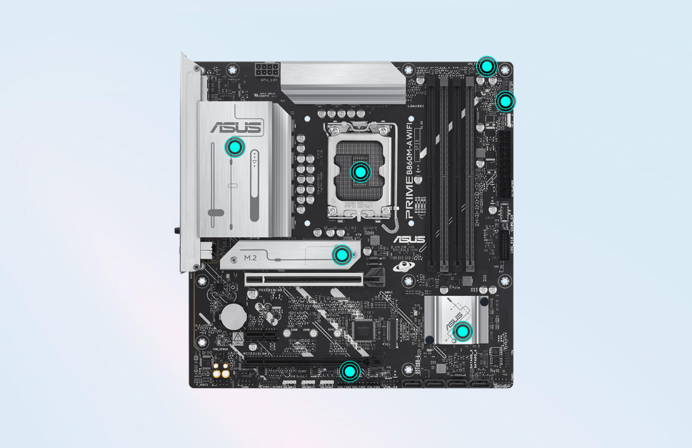 Płyta główna PRIME B860M-A WIFI została wyposażona w wiele radiatorów i szereg hybrydowych gniazd wentylatorów, które zapewniają chłód i stabilność komputera nawet przy intensywnych obciążeniach.