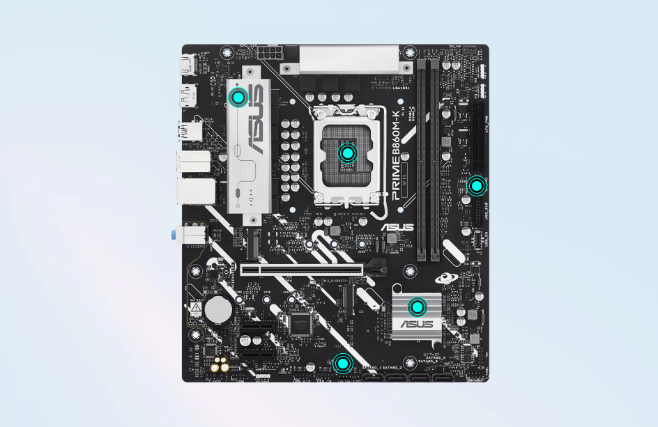 Płyta główna PRIME B860M-K została wyposażona w wiele radiatorów na płycie głównej oraz szereg hybrydowych gniazd wentylatorów, które zapewniają chłodzenie i stabilność komputera nawet przy intensywnych obciążeniach.