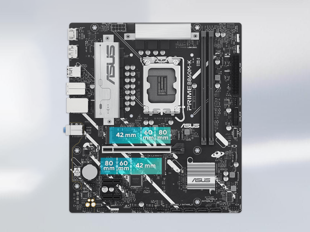 Płyta główna PRIME B860M-K oferuje łącznie dwa gniazda M.2, w tym jedno obsługujące prędkość przesyłu danych do 128 Gb/s przez PCIe 5.0 i jedno obsługujące prędkość 64 Gb/s przez PCIe 4.0. Umożliwia to szybsze uruchamianie się komputera i ładowanie aplikacji z dysków z systemem operacyjnym lub aplikacjami.