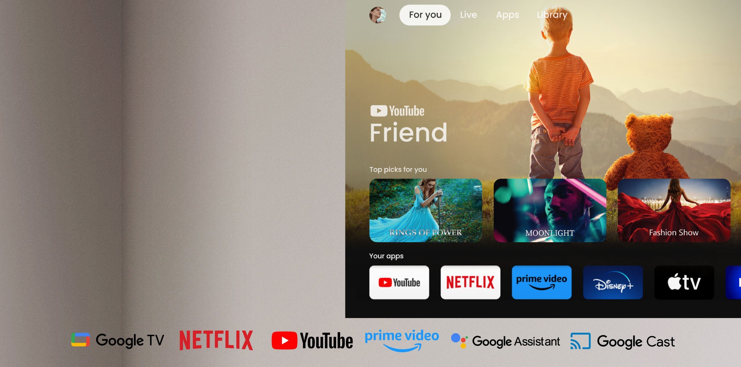 Projektor domowy BenQ GP520 z Google TV, dostarcza spersonalizowane rekomendacje i łatwy dostęp do serwisów streamingowych takich jak Netflix, Prime Video, YouTube, Disney+ i wiele innych, wszystko wzbogacone wygodą Asystenta Google.