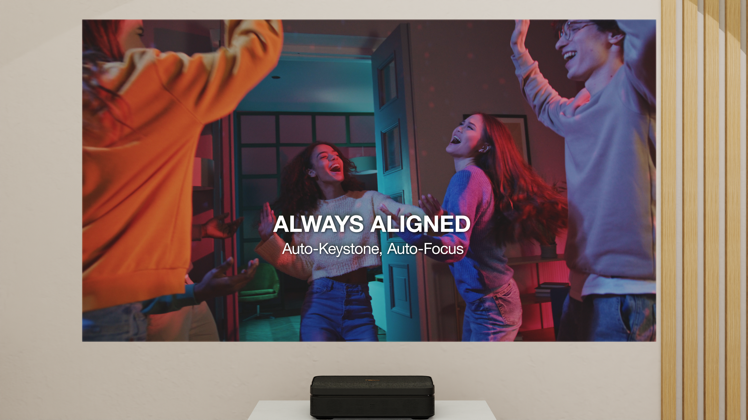 Dzięki ultraszerokokątnemu obiektywowi i innowacyjnej technologii Time-of-Flight (ToF) do automatycznej korekcji trapezowej i ostrości, możesz błyskawicznie stworzyć idealnie wyświetlany obraz o przekątnej 100” z odległości mniejszej niż 25 cm od wybranej powierzchni projekcyjnej – idealne rozwiązanie do szybkiego i swobodnego oglądania.
