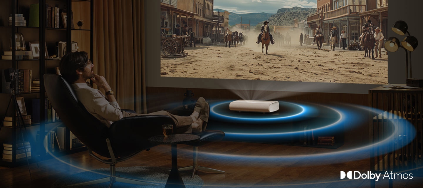 Projektor posiada wbudowany system audio o mocy 40W w konfiguracji 2.2.2. Głośniki skierowane w górę oraz dedykowane głośniki niskotonowe współpracują z technologią Dolby Atmos, tworząc efekt dźwięku przestrzennego bez konieczności podłączania dodatkowego sprzętu.