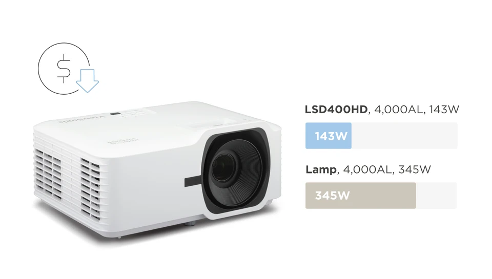Dzięki zaawansowanemu, bezlampowemu źródłu światła, LSD400HD jest rozwiązaniem wysoce energooszczędnym i ekonomicznym. Zużywa do 59% mniej energii niż konkurencyjne projektory lampowe, co przekłada się na realne oszczędności finansowe.
