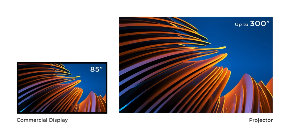 Projektor umożliwia wyświetlanie obrazu o imponującej przekątnej do 300 cali. Taka skala pozwala na stworzenie angażującego doświadczenia wizualnego przy znacznie niższym koszcie w przeliczeniu na cal w porównaniu z innymi typami wyświetlaczy komercyjnych, takimi jak monitory wielkoformatowe. To idealne rozwiązanie dla dużych audytoriów i sal konferencyjnych.
