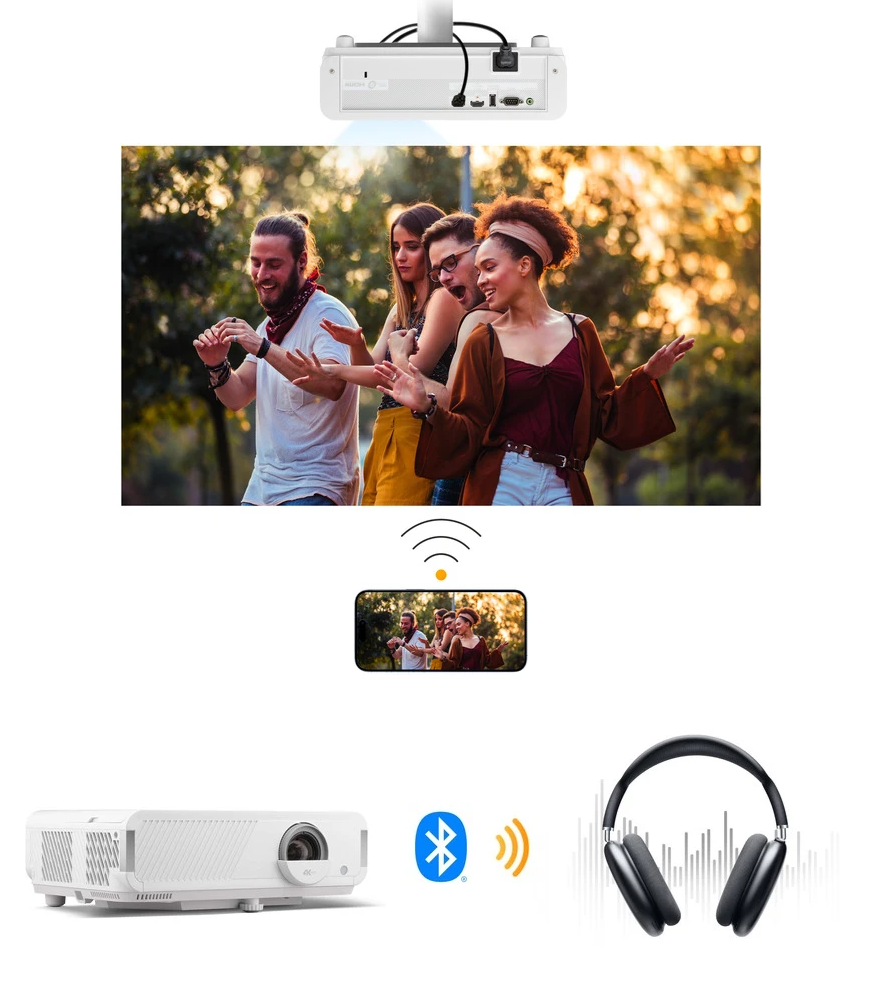 Dźwięk Bluetooth tak, jak lubisz: Przesyłaj dźwięk bezprzewodowo z projektora do swoich słuchawek Bluetooth. Odizoluj się od otoczenia i zanurz się całkowicie w świecie wielkoekranowej rozrywki.
