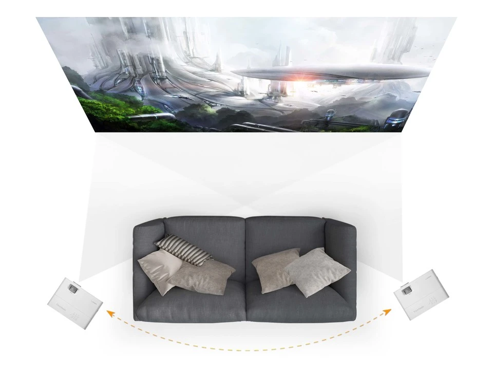 Dzięki zoomowi optycznemu 1.3x możesz precyzyjnie dostosować rozmiar obrazu bez konieczności przesuwania projektora. Funkcje korekcji geometrii w pionie i poziomie (H/V Keystone) oraz regulacja 4 narożników gwarantują idealnie prostokątny obraz, nawet jeśli urządzenie nie jest ustawione na wprost ekranu.