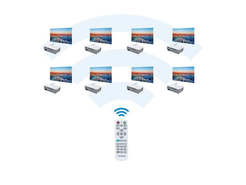 Projektor można przypisać do 8 różnych kodów pilota, co pozwala na łatwy wybór, konfigurację i obsługę wielu projektorów w jednej lokalizacji, np. podczas lekcji czy spotkań. Możliwe jest także sterowanie wybranymi projektorami, jeśli ten sam kod został przypisany zarówno do projektora, jak i do pilota.