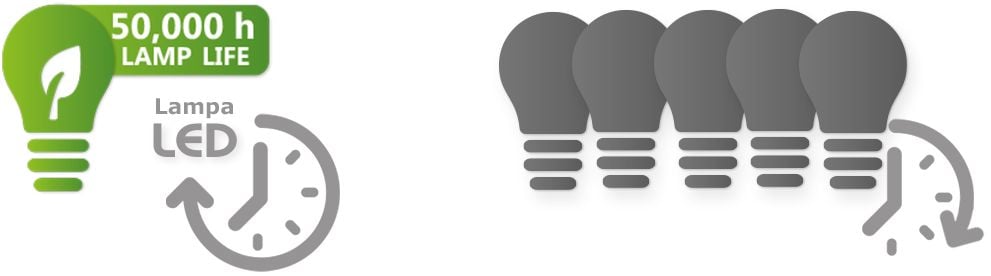 Projektor charakteryzuje się także żywotnością lampy na poziomie 50 000 godzin, co sprawia, że ten projektor jest nie tylko ekonomiczny, ale także i ekologiczny.