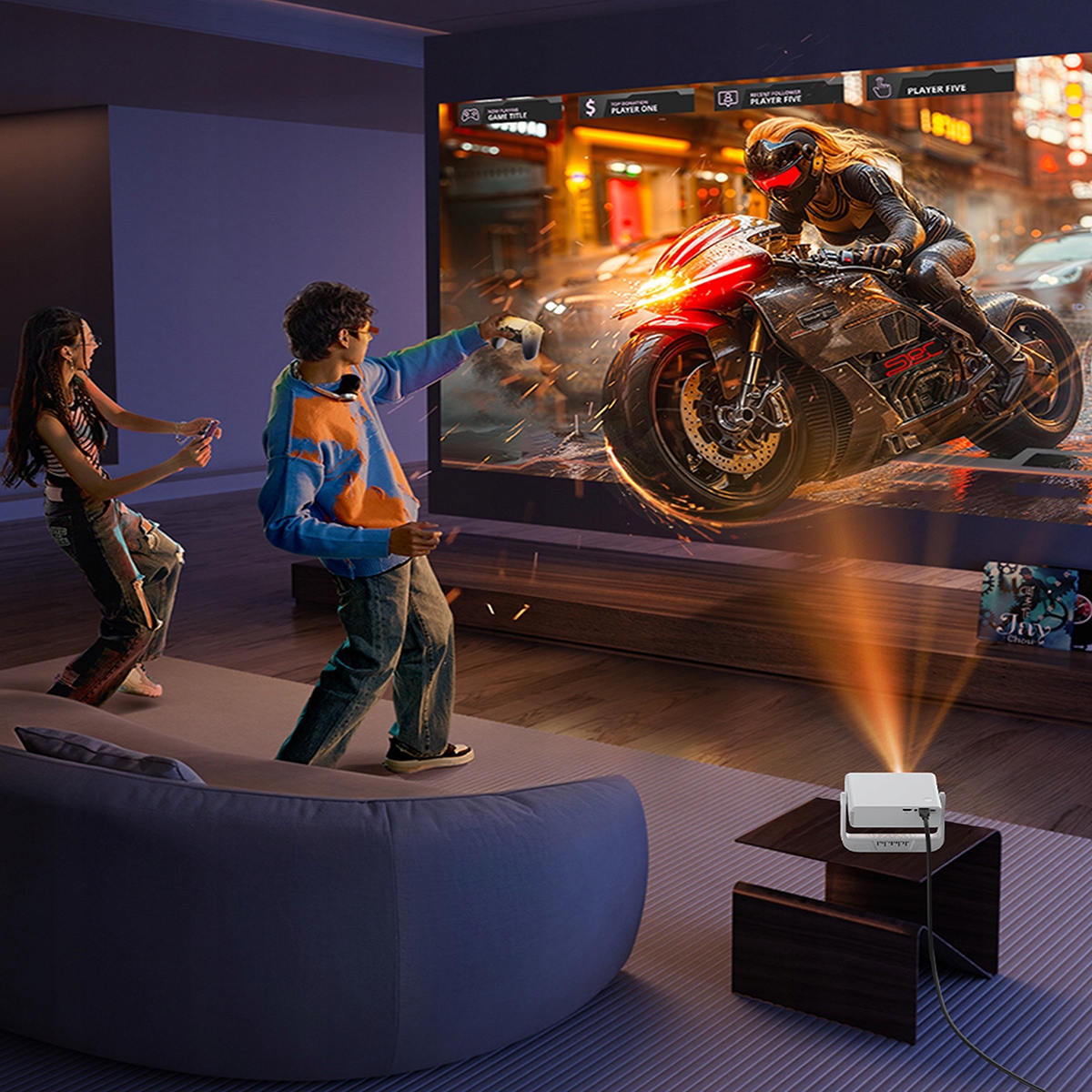 Urządzenie posiada wbudowany głośnik HiFi, który zapewnia czyste brzmienie bezpośrednio po uruchomieniu. Dzięki modułowi Bluetooth 5.0 użytkownik może również bezprzewodowo podłączyć zewnętrzne głośniki lub słuchawki. Projektor waży zaledwie 1 kg, a jego obudowa z trwałego tworzywa ABS jest odporna na codzienne użytkowanie. Obrotowy zawias umożliwia szybką zmianę kąta wyświetlania, w tym projekcję bezpośrednio na sufit.