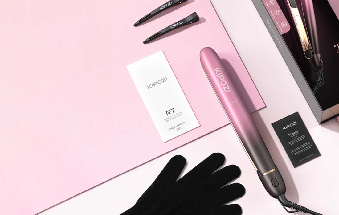Za pomocą prostownicy Kipozi R7 możesz nie tylko prostować, ale też kręcić włosy. Urządzenie zostało wyposażone w 1-calowe, tytanowe płytki 3D i bardzo szybko się nagrzewa. Umożliwia regulację temperatury w zakresie 130-230°C (250-450°F). Pozwala szybko, wygodnie i bezpiecznie stylizować włosy. Prostownica ma także wbudowany generator jonów ujemnych. W skład zestawu wchodzą też spinki oraz rękawiczka ochronna.