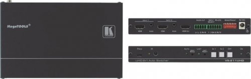 Kramer VS-211UHD jest wyposażony w porty HDMI, co umożliwia łatwe podłączenie różnych urządzeń multimedialnych. Dodatkowo, obsługuje również analogowe audio, co zwiększa jego wszechstronność.