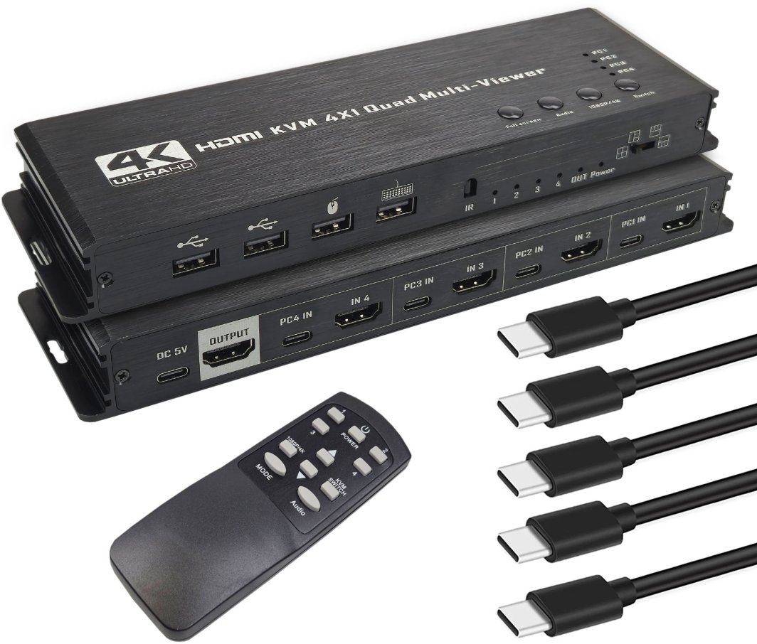 Przełącznik KVM 4x1 HDMI USB-C Multiviewer to nowoczesne rozwiązanie, które podnosi komfort pracy, umożliwiając łatwe przełączanie pomiędzy czterema komputerami. Dzięki temu urządzeniu nie musisz już martwić się o plątaninę kabli – wystarczy jedno kliknięcie, aby przełączyć się na inny komputer.