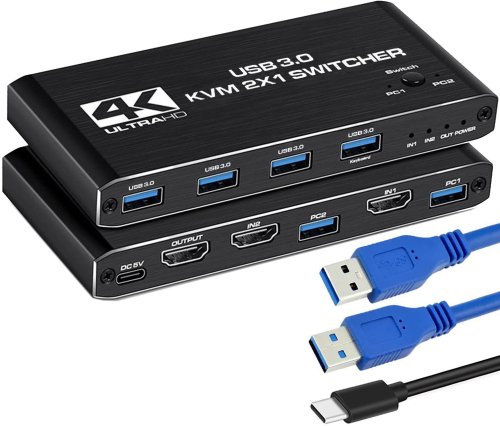 Przełącznik KVM HDMI USB to urządzenie, które umożliwia sterowanie dwoma komputerami za pomocą jednego zestawu peryferiów, takich jak monitor, klawiatura i mysz. Wyposażony w dwa złącza wejściowe HDMI pozawala na podłączenie dwóch oddzielnych sygnałów wideo idących z komputerów aby wyświetlić je na jednym monitorze. Cztery dodatkowe porty USB 3.0 o trasmisji danych do 5Gb/s pozawalają na podłączenie urządzeń takich jak: pamięci flash, drukarki, skanery i innych korzystających z interfejsu USB. Przełączanie pomiędzy komputerami odbywa się za pomocą dedykowanego przycisku znajdującego się na górze obudowy