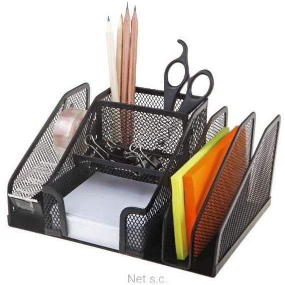 Ten praktyczny organizer biurowy został zaprojektowany z myślą o przechowywaniu długopisów, karteczek oraz innych drobnych akcesoriów biurowych, takich jak gumki czy spinacze. Dzięki różnorodnym przegrodom, użytkownik może łatwo zorganizować swoje biuro, co umożliwia szybki dostęp do niezbędnych przedmiotów.
