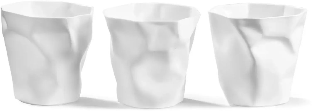 Oryginalny design Zgniecionych Kubeczków wyróżnia się minimalistycznym stylem, który doskonale wpisuje się w różnorodne aranżacje wnętrz. Dzięki neutralnemu kolorowi, kubeczki harmonijnie współgrają z innymi elementami wystroju, dodając mu nowoczesnego charakteru. Ich solidne wykonanie zapewnia długotrwałe użytkowanie, a lekka konstrukcja sprawia, że są łatwe do przenoszenia i ustawienia w dowolnym miejscu.