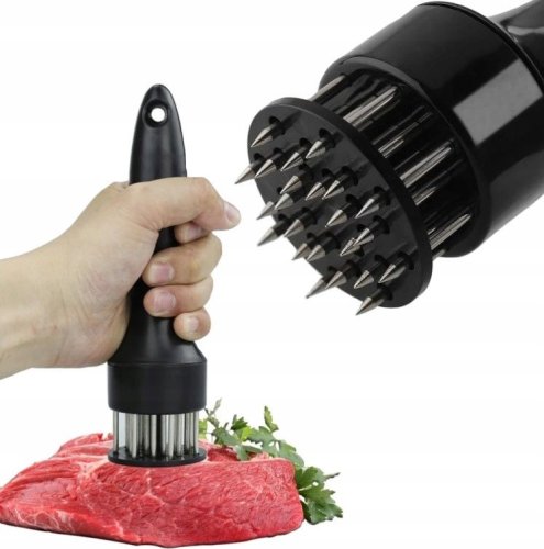 Nasz nakłuwacz do mięsa to nowoczesna i innowacyjna alternatywa dla tradycyjnego tłuczka do mięsa. Nie tylko jest cichszy, ale także zapewnia lepsze rezultaty dzięki wbijającym się w mięso kolcom, które powodują, że mięso staje się delikatne i rozpływające w ustach. Nie wymaga też dużego nakładu siły i nie przeszkadza sąsiadom tak jak tradycyjny tłuczek.