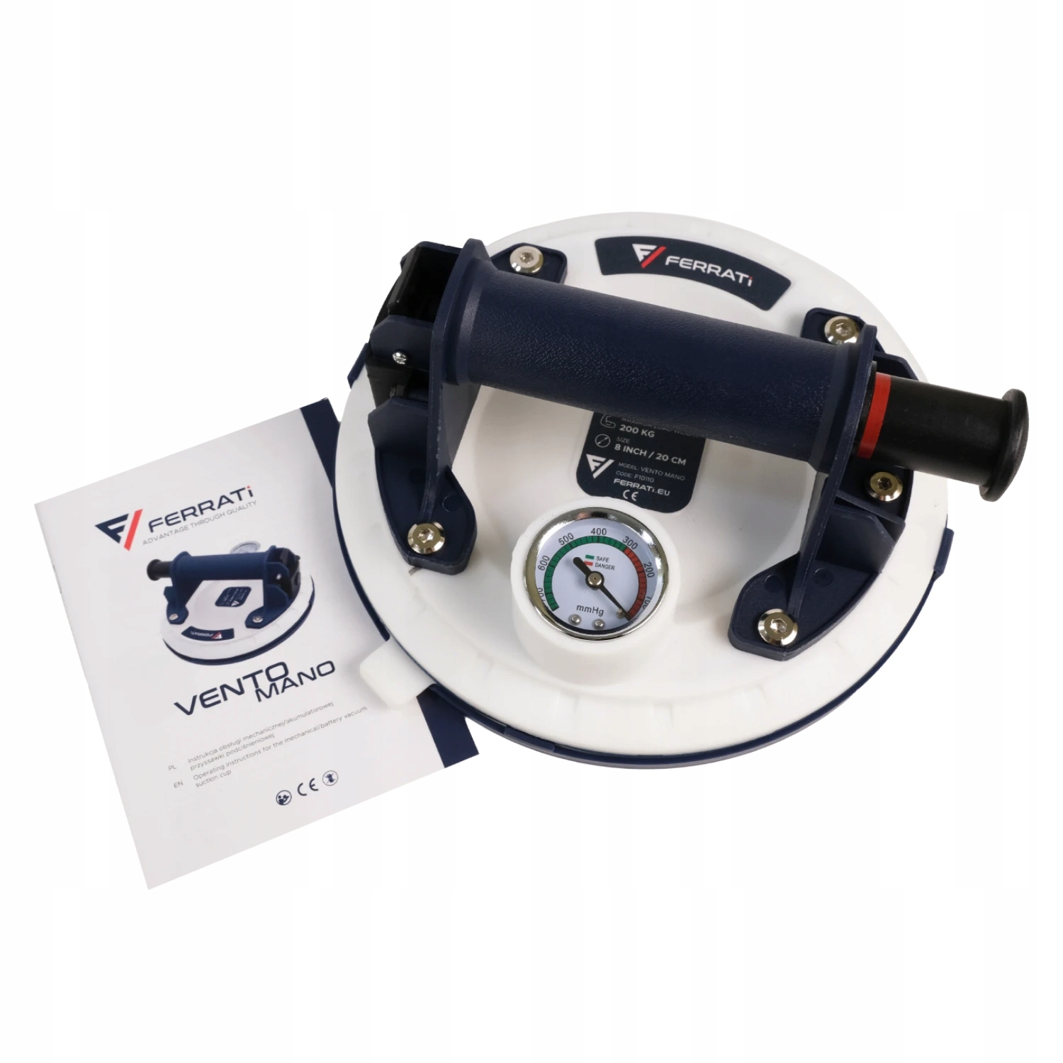 Przyssawka próżniowa z manometrem VENTO MANO charakteryzuje się wysoką jakością i ergonomiczną konstrukcją, co gwarantuje wygodne transportowanie płyt o powierzchni gładkiej jak i chropowatej. Zainstalowany manometr wskazuje siłę podciśnienia, wyraźnie poprawiając bezpieczeństwo w obszarze działań użytkownika. Zastosowany silikon z dodatkiem kauczuku syntetycznego bardzo dobrze przylega do powierzchni i nie pozostawia śladów. Dodatkowo, przyssawka posiada zawór spustowy, którym zwolnimy ciśnienie po przeniesieniu płyty. Przyssawka dostarczana jest w praktycznej walizce, aby chronić i bezpiecznie transportować produkt.