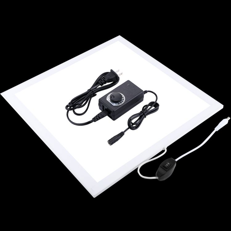Podkładka posiada w zestawie włącznik oraz regulator jasności (ściemniacz). Dzięki temu możemy optymalnie ustawić jasność świecenia diod LED w podstawce, względem warunków w jakich wykonujemy zdjęcia.