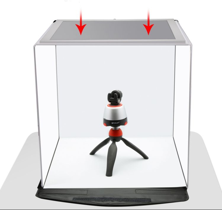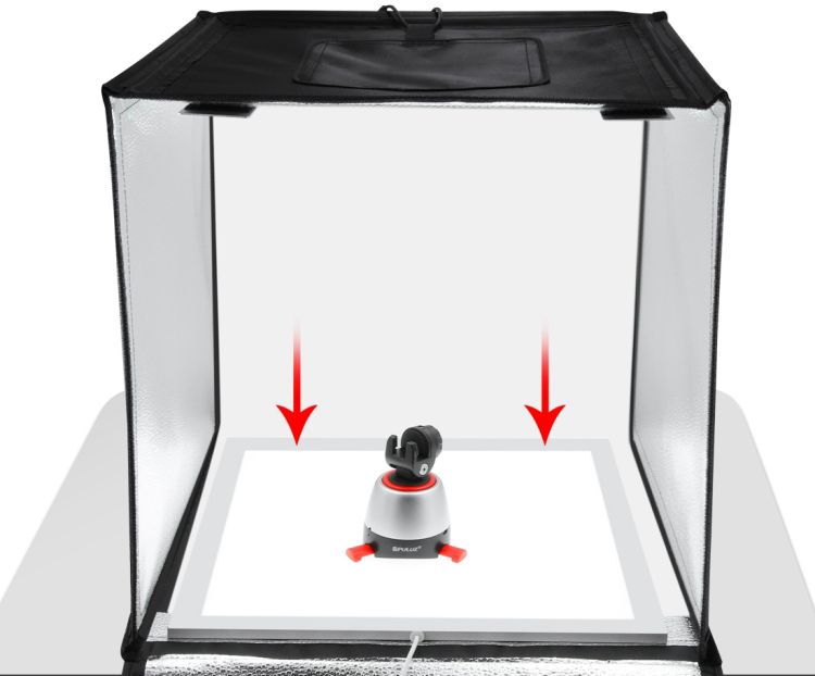 Podkładkę LED możemy umieścić pod przedmiotem, doświetlając go równomiernie od spodu. Jednakże jeśli zachodzi taka potrzeba, podkładka LED idealnie nadaje się do doświetlenia obiektu z każdej strony również od góry. Bardzo często namioty bezcieniowe są niewaściwie dośwetlone od góry, co powoduje że fotografowane obiekty mają silne cienie na zdjęciach. Aby temu zapobiec można umieścić podkładkę LED u góry namiotu doświetlając idealnie cały fotografowany obiekt od góry.