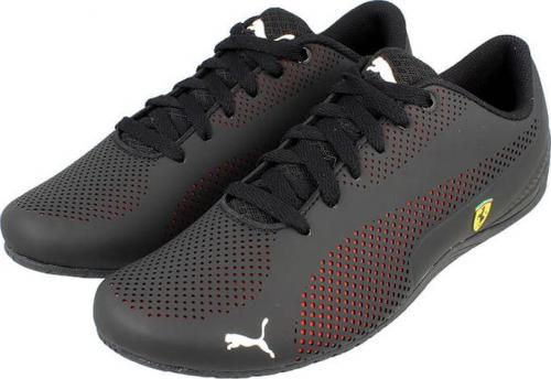 Buty męskie Puma Scuderia Ferrari Drift Cat z linii Motorsport. Cholewka wykonana z materiału syntetycznego. Perforacja podszyta czerwonym materiałem kontrastuje z czarną cholewką. Na pięcie flaga Italii oraz logo Puma, a na zewnętrznej części cholewki logo włoskiego producenta samochodów Ferrari.