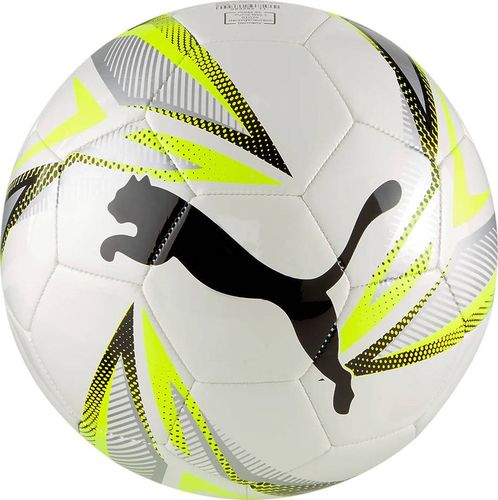 Piłka nożna marki Puma z serii Football Play Big Cat Ball w kolorze białym z żółtymi i srebrnymi dodatkami. Syntetyczna, szyta maszynowo konstrukcja stworzono z heksagonalnych paneli ułatwi ci grę na stałym poziomie. Lateksowy pęcherz zapewnia miękki kontakt, co uskuteczni kontrolę lotu oraz odbicia. Wyrazisty design dopełniono dużym logo Puma Cat. Model idealnie sprawdzi się podczas amatorskich rozgrywek na naturalnej murawie, pozwoli ci szlifować umiejętności. Produkt jest nowy, posiada oryginalne metki.