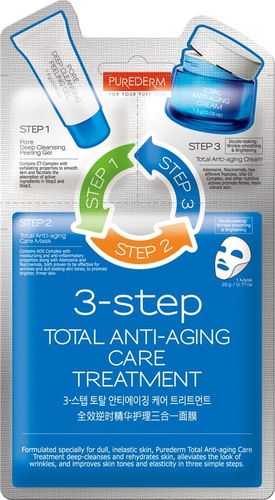 Kompleksowa, wieloetapowa kuracja stworzona z myślą o efekcie widocznego odmłodzenia, ujędrnienia i wygładzenia skóry zmęczonej, dojrzałej i pozbawionej elastyczności. Redukuje widoczność zmarszczek, odświeża i pielęgnuje skórę, pozostawiając ją miękką i promienną. Krok 1: Żel peelingujący z ekstraktem z jabłka, cytryny i pomarańczy o właściwościach złuszczających pomaga usunąć zanieczyszczenia oraz martwy naskórek, przygotowując skórę na dalsze etapy kuracji. Krok 2: Maseczka w płacie z witaminą B3, biotyną i adenozyną o działaniu nawilżającym i rozświetlającym. Krok 3: Krem z peptydami i witaminami uzupełnia kurację: nawilża i ujędrnia skórę, przywracając jej młodzieńczy wygląd.Sposób użycia: Umyj i osusz twarz. Otwórz saszetkę z żelem peelingującym (krok 1) i nanieś na skórę, omijając okolice oczu i ust. Delikatnie masuj okrężnymi ruchami, po chwili zmyj ciepłą wodą. Otwórz saszetkę z maseczką (krok 2) i nałóż ją na twarz. Pozostaw na 10-20 minut, następnie zdejmij, a resztę esencji wklep w skórę twarzy. Otwórz saszetkę z kremem (krok 3) i nanieś równomiernie na twarz. Nie spłukuj.Środki ostrożności: Tylko do użytku zewnętrznego. Nie stosować na podrażnioną lub uszkodzoną skórę. Unikać kontaktu z oczami. Chronić przed dziećmi. Produkt jednorazowego użytku.
