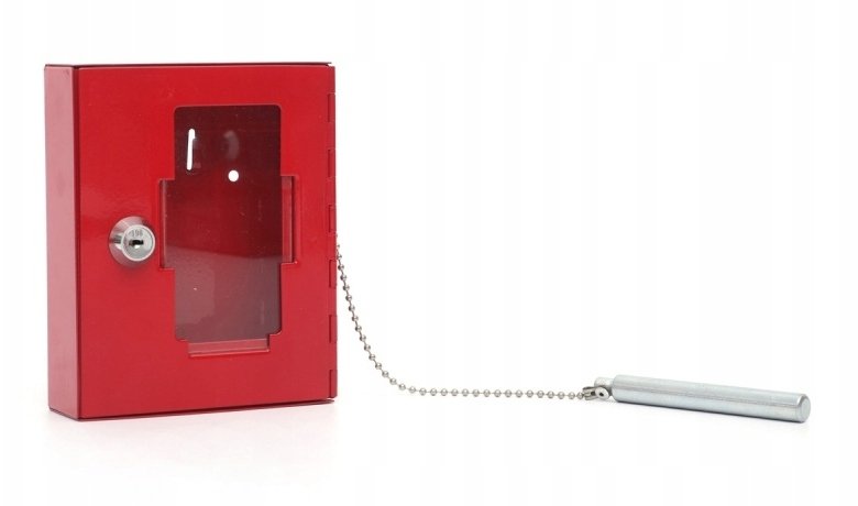 Drzwiczki szafki są wyposażone w szybkę, którą można w razie potrzeby szybko zbić, aby uzyskać dostęp do klucza w sytuacji zagrożenia. To kluczowa cecha, która może zadecydować o bezpieczeństwie w krytycznych momentach.