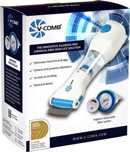 V-COMB™ bez pestycydów i chemii Prosty i łatwy w użyciu, V-Comb to wielokrotnego użytku antyalergiczny zabieg na wszy dla dzieci i dorosłych. Ten skuteczny zabieg jest bezpieczny do użytku domowego i eliminuje wszy głowowe oraz ich jaja (gnidy) bez potrzeby stosowania chemikaliów lub szamponów. Podczas gdy inne zabiegi na wszy, takie jak szampony chemiczne i grzebienie elektryczne, są bardziej niebezpieczne dla dzieci i szkodliwe dla skóry i skóry głowy, V-Comb składa się z specjalnego systemu odsysania, aby nie podrażniać skóry głowy a delikatnie chwytać wszy i gnidy, posiada pułapkę, wszy i gnidy usunięte z włosów wpadają do opatentowanego filtra przechwytywania. Po zabiegu wystarczy odłączyć filtr wychwytujący i zamknąć pokrywkę w celu higienicznej utylizacji. Wszy żyją około 30 dni, samica może złożyć do 200 jaj w ciągu życia. Jajka wykluwają się w ciągu 7 do 10 dni, dlatego ważne jest stosowanie urządzenia codziennie przez 2 tygodnie podczas inwazji. Konieczne jest przerwanie cyklu życia, aby jaja i wszy zostały wyeliminowane, zanim osiągną dorosłość. V-COMB NIE JEST ŁAGODNY DLA LUDZI I PRZYJAZNY ŚRODOWISKU inne, szkodliwe chemikalia stosowane w tych procesach często kończą jako ścieki, które zanieczyszczają nasze środowisko Czy mogę używać urządzenia na wielu dzieciach? Tak, ale upewnij się, że urządzenie jest dokładnie czyszczone po każdym użyciu. Czy mogę używać V-Comb na mokrych włosach? Tak, ale będzie skuteczniejszy na suchych włosach. Jeśli włosy są mokre lub zawierają takie produkty, jak odżywki do włosów lub inne produkty do rozczesywania włosów, zatykają urządzenie Jak korzystać z filtra przechwytującego przymocuj filtr przechwytujący do główki grzebienia upewniając się, że zatrzaśnie się (aż usłyszysz kliknięcie) następnie przymocuj główkę grzebienia do głównego korpusu, wyrównując strzałki i obróć, aby zblokować. Po zakończeniu leczenia wyjmij filtr z V-Comb i zamknij go, zatrzaskując pokrywkę przed wyrzuceniem. Czy mogę kupić filtry wymienne V-Comb, jeśli ich już nie mam? Zamienne filtry V-Comb można kupić W zestawie • urządzenie V-comb • zestaw filtrów 2 filtrów • szczoteczkę do czyszczenia grzebienia • instrukcję obsługi
