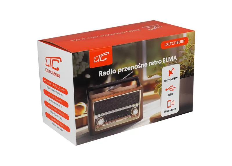 Kompaktowy radioodbiornik z teleskopową anteną i łącznością Bluetooth, nawiązujący stylistyką do urządzeń retro. Radia przenośne LTC to urządzenia wykonane z najwyższą starannością, w produkcji których zastosowane zostały komponenty wysokiej jakości. Dzięki temu produkt cechuje się długą żywotnością, niezawodnością i satysfakcją użytkowania, która zaspokoi potrzeby nawet najbardziej wymagających klientów.