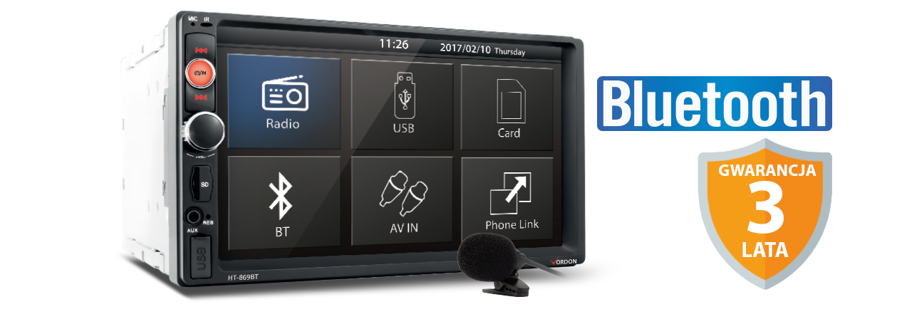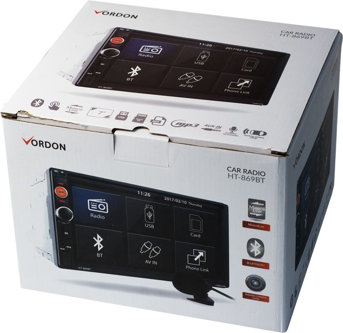 Gwarancja 36 miesięcy! W zestawie: - Radio samochodowe Vordon HT-869BT', - Pilot zdalnego sterowania - ramkę montażową, - kieszeń montażową, - mikrofon zewnętrzny, - instrukcję w języku polskim, - Kamera cofania 4SMDPL |