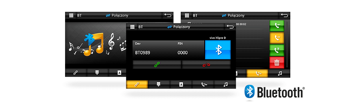 Radio posiada wbudowany Bluetooth, co pozwala na prowadzenie rozmów podczas jazdy samochodem. Dźwięk z telefonu będzie słyszany w głośnikach, natomiast wbudowany mikrofon w radiu pozwoli na prowadzenie rozmowy bez odrywania rąk od kierownicy. Urządzenie synchronizuje książkę telefoniczną z telefonem, zapamiętuje historię połączeń, oraz posiada funkcję automatycznego odbierania połączeń. Po pierwszym sparowaniu smartfona, urządzenie automatycznie łączy się z telefonem. Protokół A2DP pozwala na bezprzewodowe odtwarzanie muzyki z telefonu. |