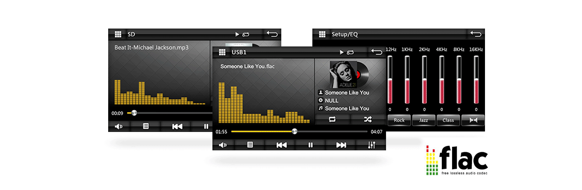 Urządzenie posiada zintegrowany odtwarzacz audio umożliwiający odtwarzanie muzykinp. z karty microSD oraz możliwość współpracowania z innymi urządzeniami przez połączenie Bluetooth. Urządzenie obsługuje m. in. MP3/WMA/WAV/APE/AAC oraz FLAC, który jest kodekiem umożliwiającym bezstratną kompresję cyfrowego dźwięku. W przeciwieństwie do innych kodeków, nie usuwa żadnych danych ze strumienia audio, pozostawiając dźwięk wierny oryginałowi. 10 pasmowy korektor umożliwia dostosowanie brzmienia do własnych preferencji lub wybranie z predefiniowanych trybów Flat, Pop, Rock, Jazz, Klasyczny. |