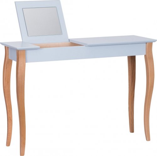 Toaletka z lustrem LILLO 105 polskiej produkcji Toaletka z lustrem LILLO 105 z lusterkiem to nie tylko toaletka, ale również niezwykle dekoracyjny mebel. Blat wykonany jest płyty MDF laminowanej o barwie jasnoszarej, a dekoracyjnie wygięte nogi to drewno bukowe. Toaletka jest projektem polskich twórców, którzy pragną, aby ich meble były nie tylko funkcjonalne, ale przede wszystkim efektowne. Toaletka z lustrem LILLO 105 cm pomoże utrzymać porządek, a wszystkie najpotrzebniejsze rzeczy zawsze będą pod ręką zgromadzone w jednym miejscu. Każda z Pań z pewnością doceni walory toaletki, jeśli jej makijaż codziennie będzie perfekcyjny. Wystarczy unieść lusterko i odkrywamy schowek na biżuterię, lub kosmetyki. Jeżeli jest nam potrzebne biurko w jednej chwili opuszczając lusterko - mamy idealne miejce na laptopa, lub inne matriały biurowe. Cechy produktu polskiej produkcji toaletka do sypialni, salonu itp., blat wykonany z laminowanej płyty MDF w kolorze jasnoszarym, nogi z drewna bukowego, toaletka jest w zestawie z lusterkiem, praktyczny schowek w blacie, do samodzielnego montażu, w swojej ofercie posiadamy szeroki wybór mebli pozwalających na kompleksowe wyposażenie mieszkania