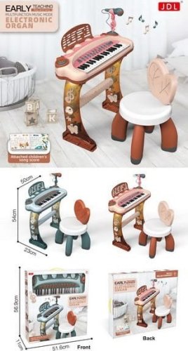 | Pianinko na stojaczku z mikrofonem i stołeczkiem dla dzieci od 3-go roku życia. Pianinko zasilane jest bateriami typu 4 x AA 1,5 V (brak w zestawie). Posiada 22 klawisze białe i 15 czarnych. Klawisze białe dodatkowo są oznaczone, co ułatwia naukę, a w zestawie znajduje się książeczka z przykładowymi nutami do zagrania kilku piosenek. Podczas naciskania klawisze białe podświetlają się, a także boki stojaka. Pianinko posiada dźwięki rocka, disco, walca, marsza, odtwarza dźwięki instrumentów pianina, trąbki, fortepianu, organów i gitary. Jest też wersja demo, która uruchamia wesołe melodie. Możemy nagrywać grane piosenki, a potem je odtwarzać. Pianinko posiada wejście na mikrofon, wejście MP3 i wejście zasilania.
