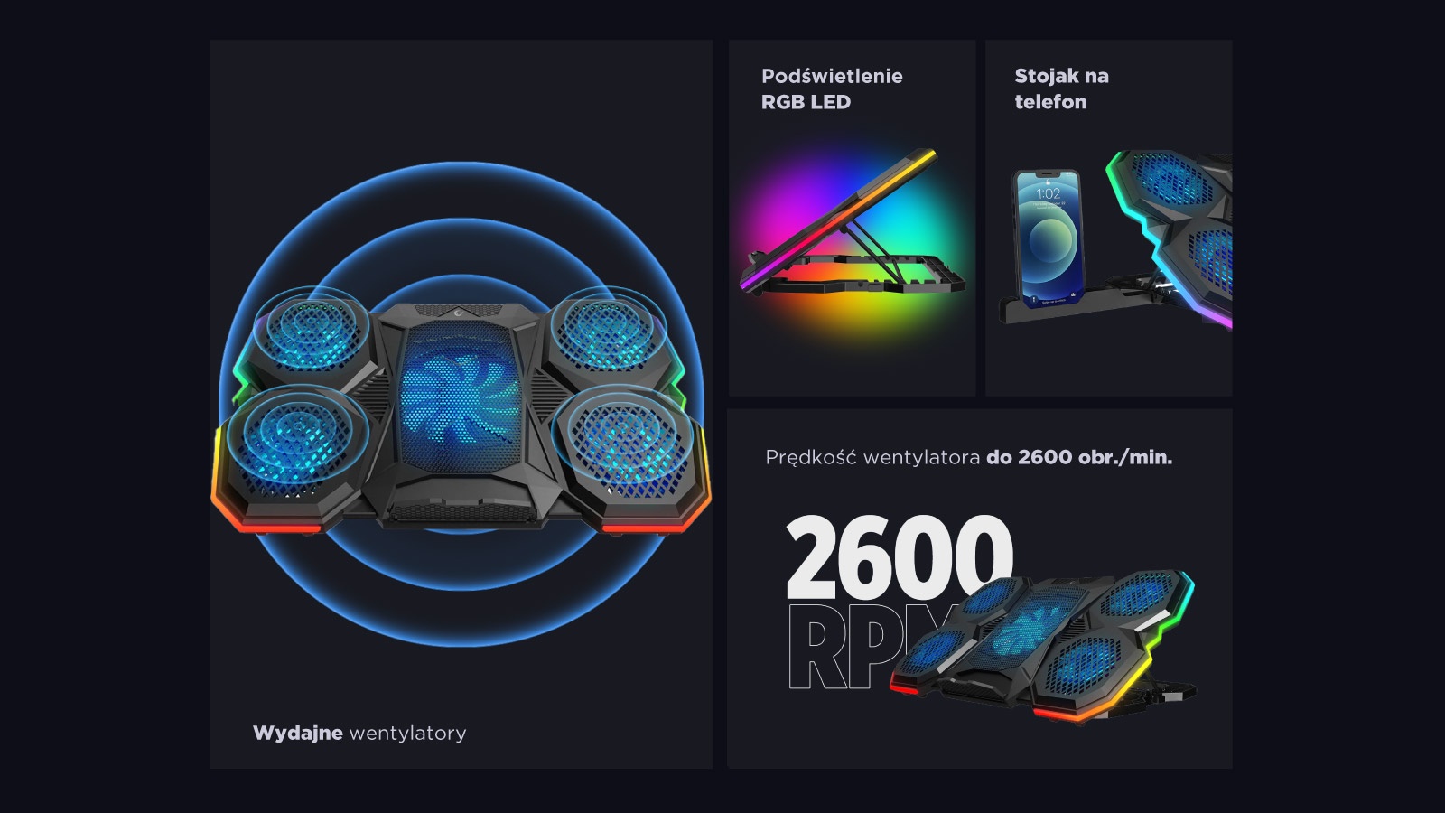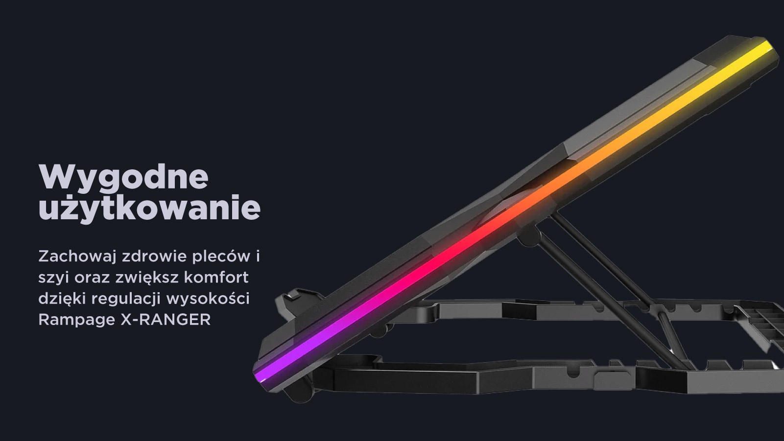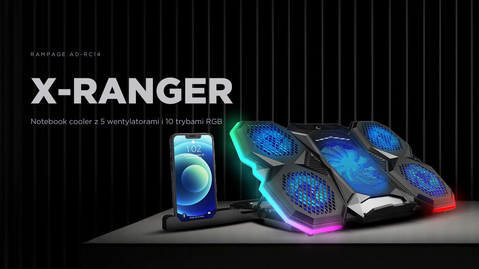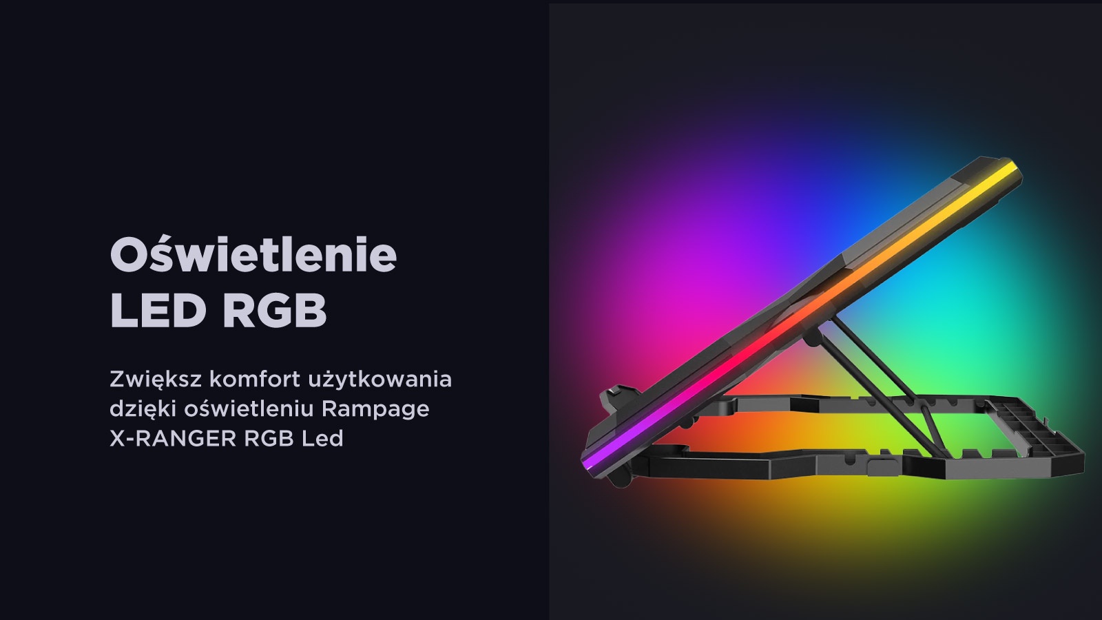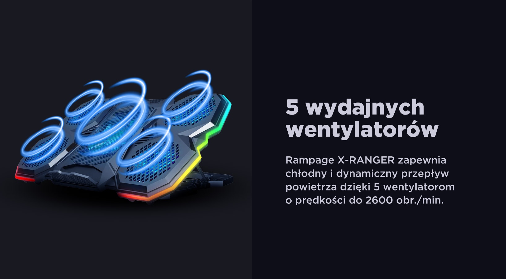 Rampage AD-RC14 X-Ranger to nowoczesny stojak chłodzący zaprojektowany z myślą o laptopach od 9 do 17 cali. Wyposażony w pięć wentylatorów, w tym jeden o średnicy 125 mm i cztery mniejsze 70 mm, zapewnia skuteczne chłodzenie, nawet podczas intensywnego użytkowania. Dodatkowe podświetlenie RGB z dziesięcioma trybami nadaje estetyczny wygląd i podkreśla gamingowy charakter urządzenia.