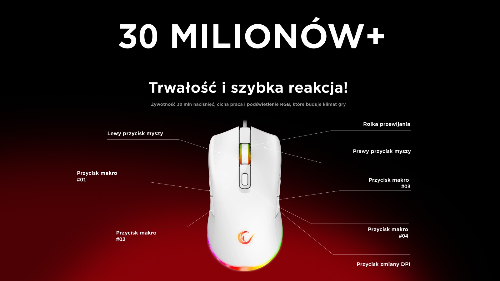 Zyskaj przewagę dzięki myszy wyposażonej w sensor optyczny o czułości do 12800 DPI. Dzięki dedykowanemu przyciskowi zmiany rozdzielczości, w ułamku sekundy przełączysz się między trybem precyzyjnego snajpera a błyskawicznymi manewrami w dynamicznych shooterach. 8 programowalnych przycisków, w tym aż 4 dedykowane makrom, pozwoli Ci przypisać skomplikowane skróty bezpośrednio pod palce, co skróci Twój czas reakcji do absolutnego minimum.