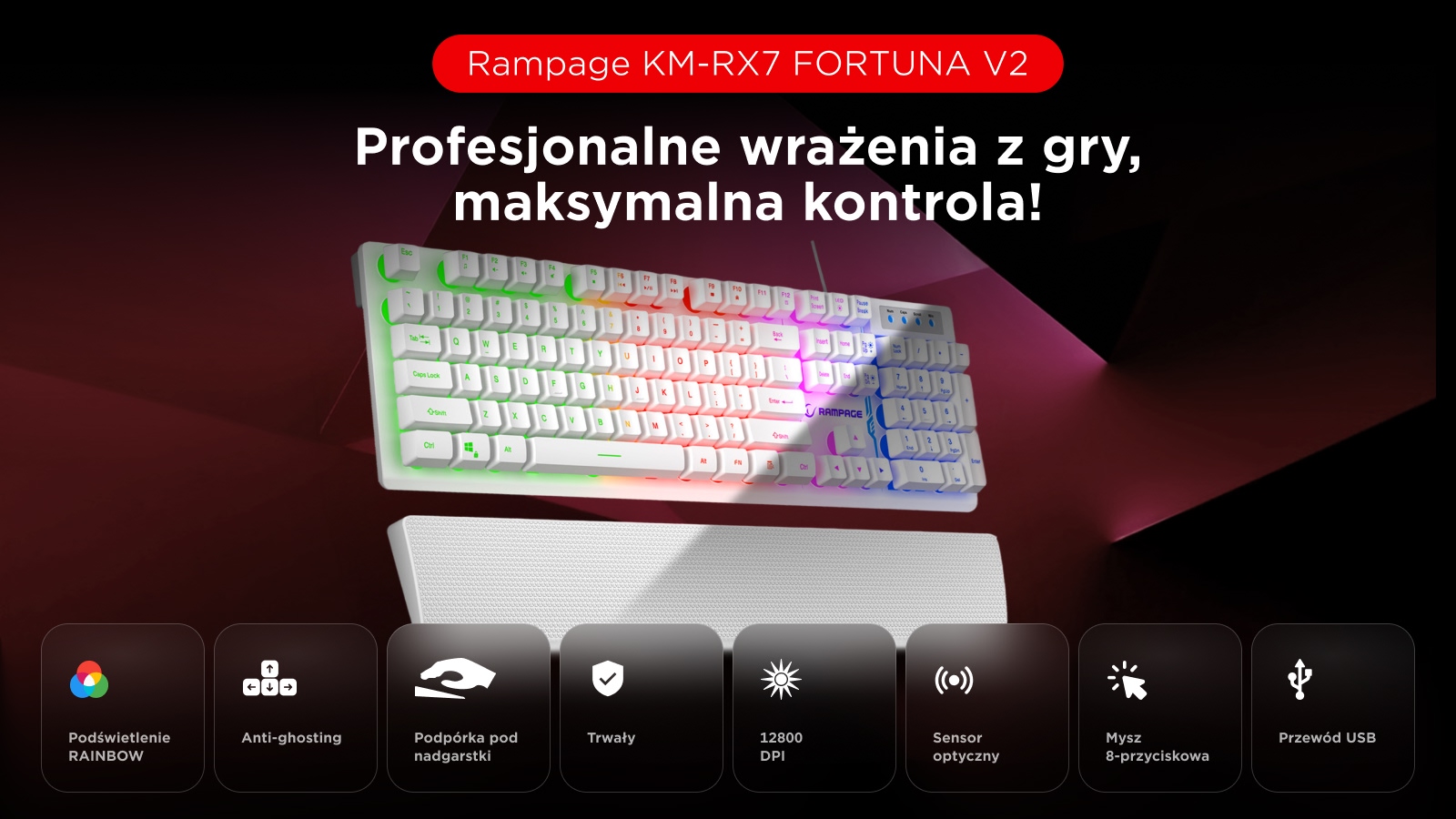 Przejmij pełną kontrolę nad polem bitwy i przenieś swoją rozgrywkę na zupełnie nowy poziom. Zestaw Rampage KM-RX7 Fortuna V2 to potężny duet dla graczy, którzy nie uznają kompromisów między efektownym stylem a zabójczą precyzją. Połączenie responsywnej klawiatury z zaawansowaną myszą 12800 DPI sprawia, że każde Twoje kliknięcie staje się decydującym ruchem w drodze po zwycięstwo. Zapomnij o ograniczeniach sprzętowych – tutaj liczy się tylko Twój refleks.