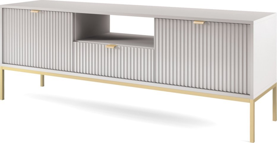 Wymiary szafki to szerokość 154 cm, wysokość 56 cm i głębokość 39 cm. Wykonana jest z obrzeża ABS, uchwyty ze szczotkowanego aluminium w kolorze złotym, 2x drzwi (zawiasy puszkowe), 1x szuflada (prowadnice kulkowe GTV - pełen wysuw), korpus z płyty laminowanej 16 mm oraz ryflowane fronty z płyty MDF 18 mm. Solidne metalowe nogi malowane proszkowo podkreślają stabilność i trwałość szafki.