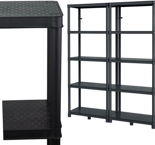 Regał posiada pięć półek, z maksymalnym obciążeniem na każdą półkę wynoszącym 35 kg, co daje łączną nośność całkowitą do 440 kg. Dzięki zastosowaniu tworzywa sztucznego (PP), regał jest odporny na wilgoć i korozję, co sprawia, że doskonale sprawdzi się w wilgotnych warunkach. Gładkie powierzchnie półek ułatwiają utrzymanie czystości, co jest istotne przy przechowywaniu produktów spożywczych lub narzędzi.