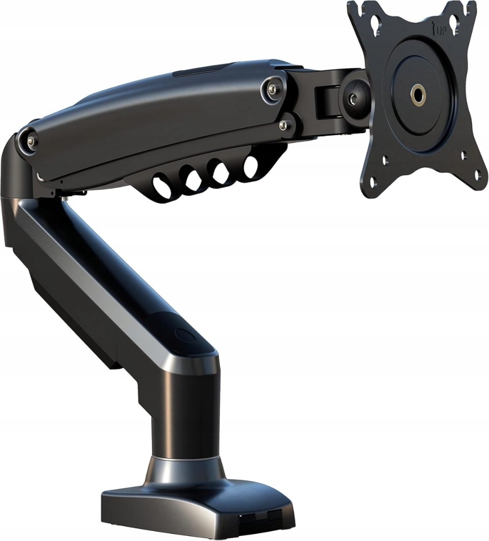 Uchwyt zapewnia pełną regulację 3D, co umożliwia jednoczesne dostosowanie wysokości, nachylenia oraz obrotu ekranu. Dzięki zastosowaniu sprężyny gazowej, regulacja wysokości jest płynna i prosta, co pozwala na idealne dopasowanie pozycji monitora do indywidualnych potrzeb użytkownika.