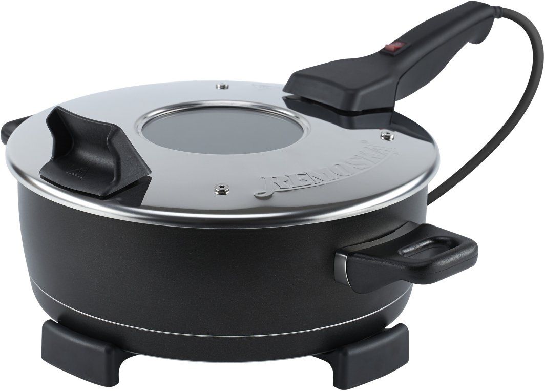 Remoska R22F/01 została zaprojektowana z myślą o trwałości i funkcjonalności. Pokrywa z lustrzanym wykończeniem ze stali nierdzewnej oraz szklany element dodają elegancji, a jednocześnie zapewniają łatwość w użytkowaniu. Miska z aluminium z powłoką Teflon® oraz podstawka z termoplastu gwarantują wysoką jakość i bezpieczeństwo użytkowania.
